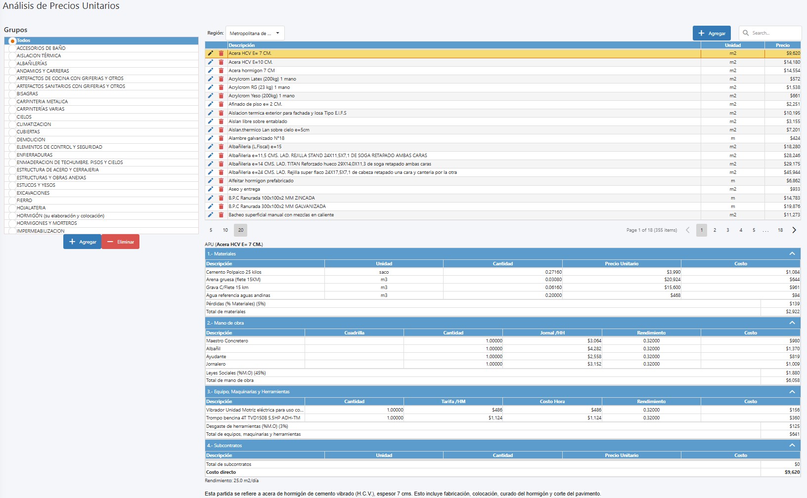 Al hacer clic sobre un ítem se desplegará el análisis de precios unitarios desglosado en Equipos, Mano de obra y Materiales.